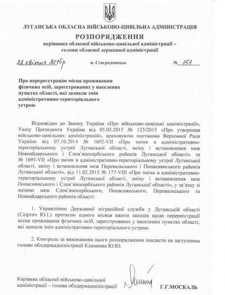 Согласно распоряжению Г. Москаля, Управление государственной регистрационной службы в Луганской области в течение месяца перерегистрирует жителей Крымского, Трехизбенки, Счастья, Новотошковки и других населенных пунктов (всего 17) на контролируемой Украиной территории.