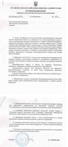 Руководитель Луганского военно-гражданской администрации Геннадий Москаль распорядился запретить торговлю любыми спиртными напитками (включая пиво) в населенных пунктах области, расположенных на линии разграничения огня.