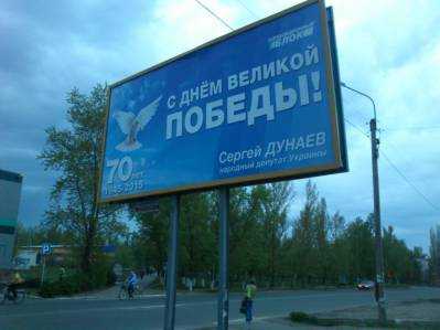 В городе Рубежное, Луганской области, появились биллборды народного депутата Украины Сергея Дунаева, на которых он поздравляет жителей «с Днем Великой Победы».