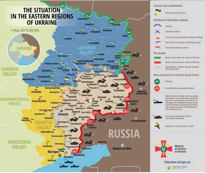 Редакция "Час Пик" СНБО Украины опубликовал карту АТО по состоянию на 7 мая 2015 года. Как сообщалось ранее, наибольшая активность противника наблюдается в направлениях населенных пунктов Счастье, Станица Луганская и г. Лисичанск. Теги: ДонецкаяАТОНовости Донбасса По теме Россия уничтожила промышленность Донбасса - люди вынуждены работать за едуВСУ освободили девять населенных пунктов на Очеретинском направлении и сдерживают РФ под ПокровскомВ Донецкой области после российского обстрела поврежден аммиакопровод "Одесса-Тольятти" - ВСУ