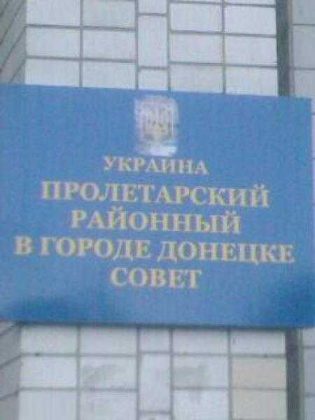 Пролетарский райсовет в Донецке снова стремится к Украине: с вывески Пролетарского районного совета Донецка исчезла наклейка с российским символом.