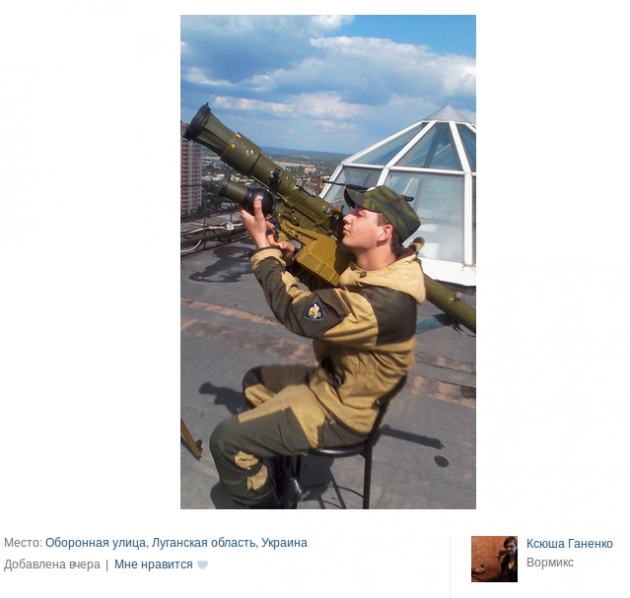 На крыше одного из зданий по ул. Оборонной сидит боевик с переносным зенитным ракетным комплексом.