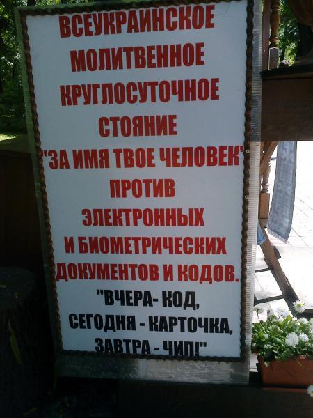 И в солнечный день и в дождливую погоду у здания Верховной Рады на ул. Грушевского ежедневно проходит круглосуточное молитвенное стояние против электронных и биометрических документов и кодов. С этим злом современной цивилизации вызвалась бороться одна из церковных организаций, предположительно подчиняющаяся Московскому Патриархату.