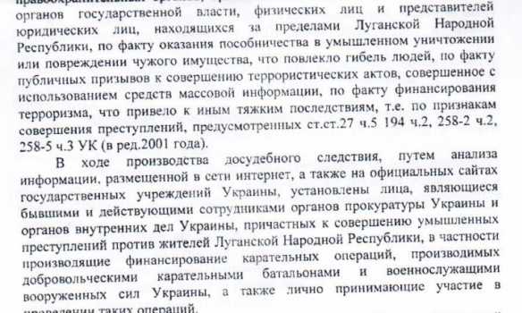 В документе также отмечается, что соответствующие органы "ЛНР" установили силовиков и гражданских, поддерживающих Украину и "наносящих вред жителям "ЛНР", "путем анализа информации в интернете и на официальных сайтах госорганов Украины".