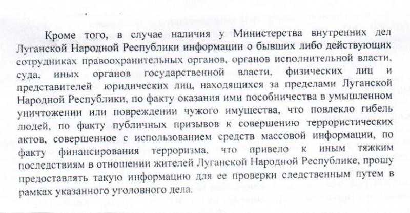 "В случае установления местонахождения бывших либо действующих сотрудников правоохранительных органов, органов исполнительной власти или при попытке их проникновения на территорию "ЛНР" организовать их временное задержание с последующим доставлением в "прокуратуру "ЛНР" для проведения следственных действий", - говорится в обращении.