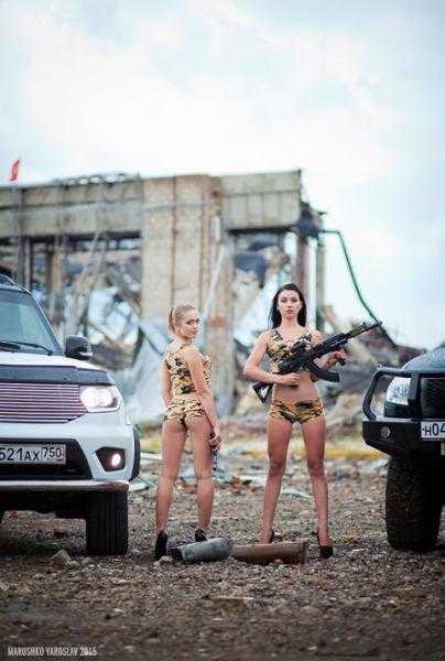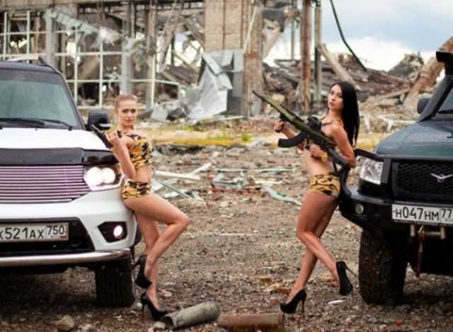 В Луганске на руинах аэропорта, в боях за который погибли 20 защитников Украины, 49 десантников и экипаж сбитого террористами ИЛ-76, полуголые девушки с оружием устроили эротическую фотосессию на фоне Уазов. Фотографии опубликовал Артур Ахмадуллин в автомобильной соцсети Drive2.ru, отмечают Патриоты Украины.