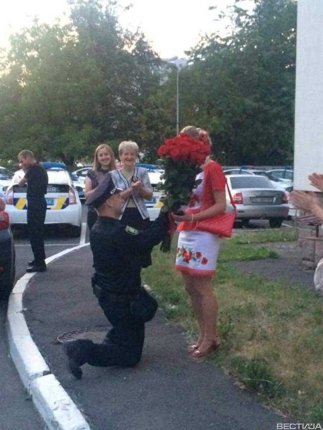 Предложение руки и сердца получилось очень трогательным и необычным. "Последнее построение перед работой. Последние инструкции. Город ждёт. И тут неожиданно: "Инспектор патрульной службы такой-то, выйти из строя!"