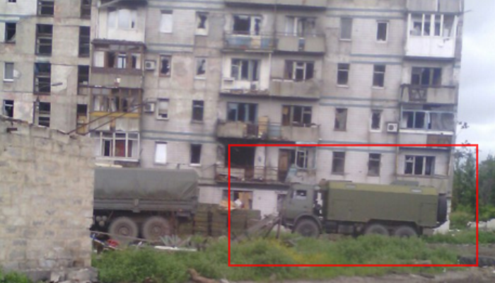 «В ходе OSINT-разведки, командой InformNapalm.org были обнаружены фото современного российского комплекса радиоразведки «Торн» на базе автомобиля КамАЗ. Место фото идентифицировано по адресу: Донецк, ул. Взлетная, 11а - это многоэтажный дом, который уже разрушен и расположен возле аэропорта города Донецк», - говорится в сообщении.