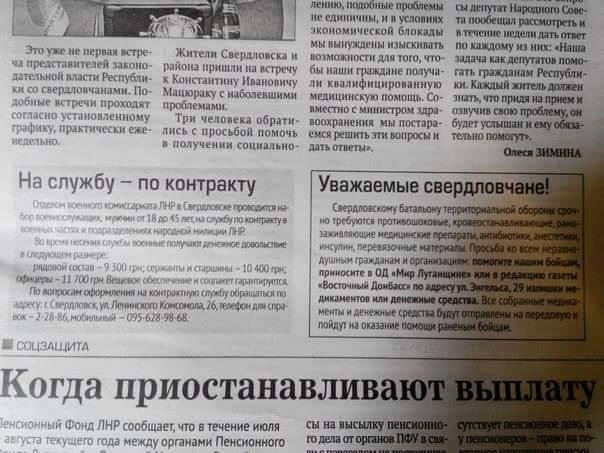 "Военный комиссариат" сепаратистов "ЛНР" обещает добровольцам, которые пойдут в ряды "армии", зарплаты в 10 тысяч гривен и социальный пакет. Снимок объявления из местной газеты выложил в Facebook журналист Андрей Цаплиенко.