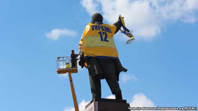 В Запорожье 7 сентября на площади Ленина состоялась акция в поддержку сборной Украины по футболу в отборочных играх Евро-2016. На расположенный здесь памятник Ленину фанаты повесили футбольную форму в цветах национальной сборной Украины. В руке скульптуры также было закреплено соответствующее фанатскую «розу» (так болельщики называют шарф с символикой).