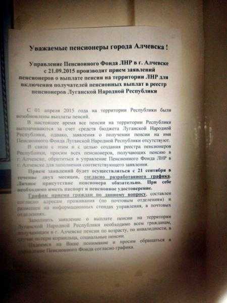 С 21 сентября в оккупированном Алчевске Луганской области начнется прием заявлений пенсионеров о выплате пенсий на территории «ЛНР». Таким образом, так называемый «пенсионный фонд ЛНР» планирует создать свой реестр пенсионеров.