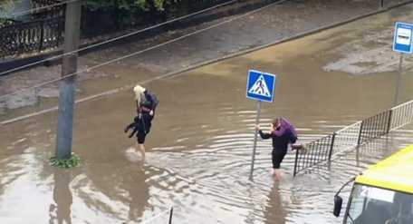 В сети опубликовано видео, на котором сотрудники патрульной полиции Львова переносят пассажиров маршрутки через огромную лужу, образовавшуюся в результате прошедшего в городе мощного ливня.
