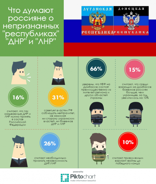 При этом большинство опрошенных россиян (66%) все же уверены, что незаконные вооруженные формирования на Донбассе состоят преимущественно из жителей региона и других областей Украины (в июле 2014 года таких россиян было 88%).