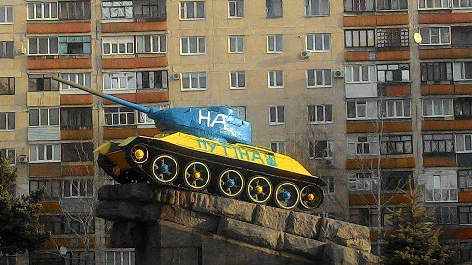 В Лисичанске Луганской области в ночь на понедельник неизвестные патриоты разукрасили мемориал «Танк» в цвета государственного флага Украины.