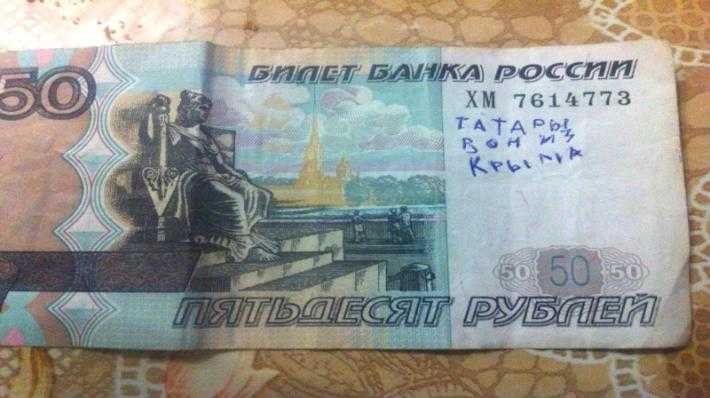 Очевидцы сообщили, что получили 50-рублевую купюру с текстом "Татары вон из Крыма" на сдачу в одном из супермаркетов города 25 декабря, передают 15 минут.