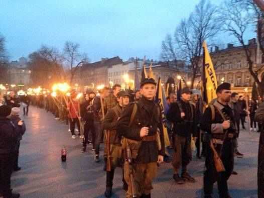 В акции приняли участие активисты гражданского корпуса «Азов», УНА-УНСО и «Правого сектора». Участники шествия прошли от памятника Тарасу Шевченко на проспекте Свободы к Камню борцам за свободу Украины на улице Витовского.