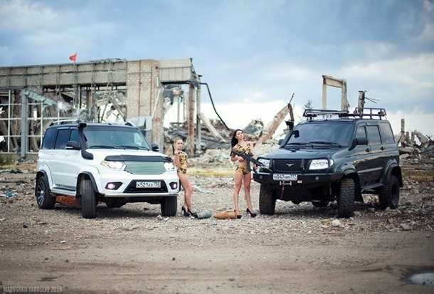 На одной из фотографий на фоне дорогих автомобилей так называемые "модели" держат в руках флаг России.