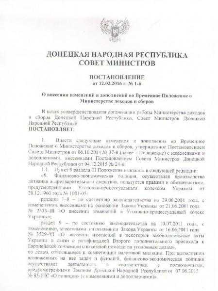 Главарь «ДНР» А.Захарченко подписал «Постановление Совета министров ДНР» №1-6, которым определил функции созданной боевиками «финансово-экономической полиции».