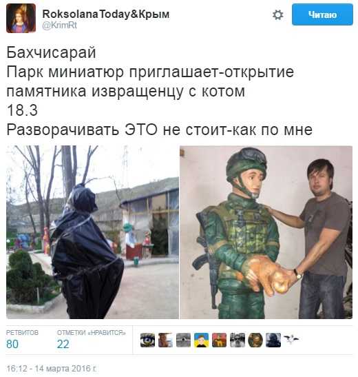 "К годовщине аннексии Крыма оккупанты открыли памятник российскому солдату, насилующему кота", - саркастично отметил пользователь Народный проект.