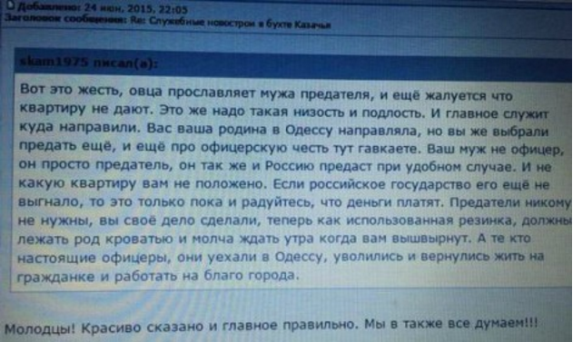 Предателей и приспособленцев никто не любит. Такой вывод можно сделать из комментариев жителей Крыма на одном из местных форумов, где жена офицера-предателя пожаловалась на то, что мужу не дают квартиру.