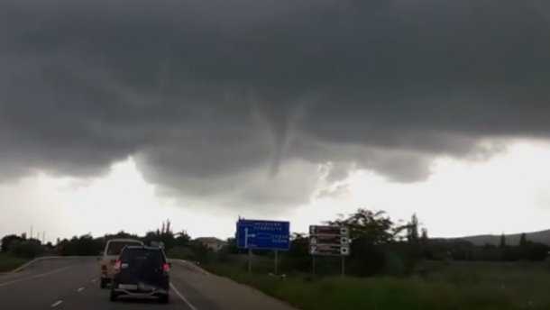 В оккупированном Крыму, в районе Керчи, небо затянуло грозовыми черными облаками и пронесся смерч.