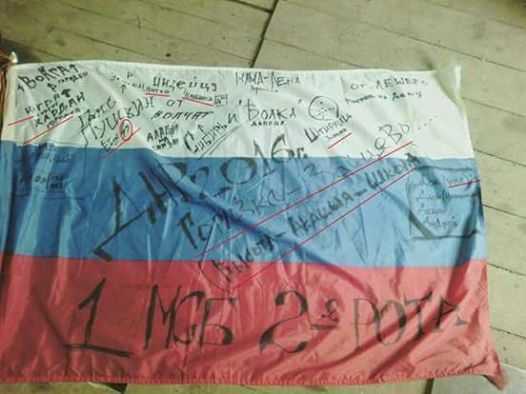 Георгий Тука показал фото трофейного флага Российской Федерации. Триколор пестрит надписями российских "шахтеров и трактористов" и заблудившихся "ихтамнетов".