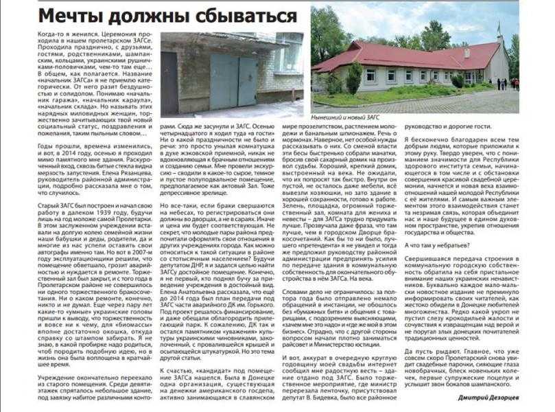Статья про отжатое здание называется "Мечты должны сбываться". Тут сразу джекпот, можно даже дальше не читать. Но там в тексте все поистине прекрасно. Там душераздирающий рассказ о том, как в Донецке разграбили и раздолбали старый ЗАГС, а потом "мечты сбылись" и наконец-то удалось отжать "хороший крепкий домик, выстроенный на века" трудолюбивыми мормонами и перевезти обоссаный аборигенами ЗАГС туда. Обязательно почитайте.