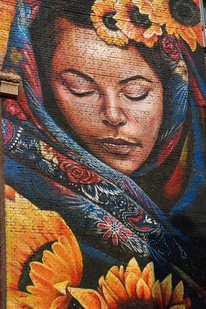 В столице на высотном доме появился новый яркий мурал. Художник Мата Руди из Коста-Рики изобразил прекрасную девушку в цветастом платке и в окружении подсолнухов.