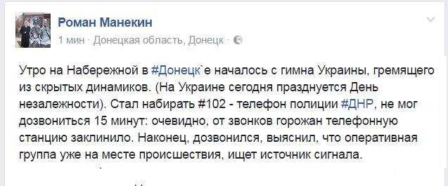 "Донецк передает поздравления с Днем Независимости. Фото сделано на Набережной сегодня утром. Слава Украине!" - пишет он.