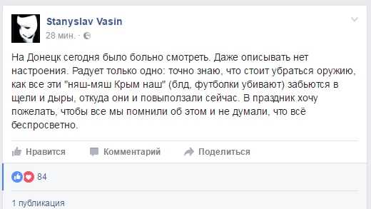 "На Донецк сегодня было больно смотреть. Даже описывать нет настроения. Радует только одно: точно знаю, что стоит убраться оружию, как все эти "няш-мяш Крым наш" (блд, футболки убивают) забьются в щели и дыры, откуда они и повыползали сейчас. В праздник хочу пожелать, чтобы все мы помнили об этом и не думали, что всё беспросветно" - пишет Stanyslav Vasin.