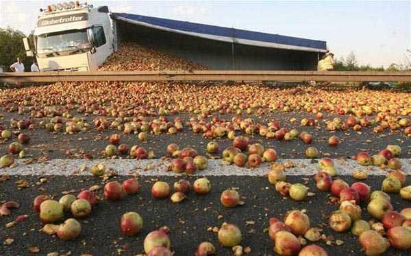 Причиной стал лопнувший борт грузовика, перевозившего фрукты. Из-за поломки яблоки высыпались на землю.