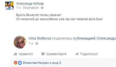 Как всегда радует В Контакте, в группе Типичная Попасная создан пост Что происходит??? Где это так стреляют??? Все дрожит(( и уже больше 200 комментариев. Люди видят зарево, в домах дрожит мебель, где-то сообщают о пожаре, кто-то пишет "ребята, держитесь" об украинских военных, в ответ получает гневный ответ от Svetlana Lonely, которая начинает рассказывать откуда на самом деле "херачат", ведет речь о "бедных детках", о зря обзываемых "сепарах". Переходим на ее аккаунт - город проживания Москва, самая старая запись - 5 октября, и, главное, она сидит дома и слышит взрывы! Комментарий масквички сердечками пометили 14 человек - рекорд в этой переписке.