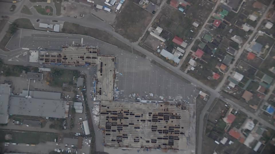 Вид на магазин "Эпицентр". Хорошо видно, что здание пострадало во время боевых действий. Но еще больший ущерб был нанесен мародерами из числа местных бандформирований, которые пытаются называть себя милицией, претендуя на какую-то законность...