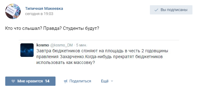 Из комментариев под постом можно сделать вывод, что жители Макеевки не очень-то довольны такой принудиловкой (орфография и стилистика сохранены):