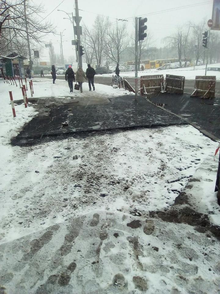 В спальных районах столицы Украины зафиксированы случаи выкладывания асфальта в снег.