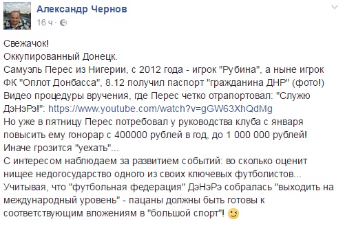 После получения паспорта "фейковой республики" новоиспеченный гражданин "ДНР", игрок местного ФК Самуэль Агонга Переса потребовал гонорар до 1 млн рублей в год.