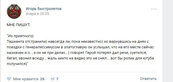 «Из приятного) Ташкента отстранили) навсегда ли, пока неизвестно) но вернувшись на днях с поездки с генералиссимусом в златоглавую он услышал, что на его месте сейчас назначен и.о., а он не при делах…) говорят Герой потерял дал речи, суетился, бегал, звонил всюду… жаль никто на видео это не снял… вот бы ролик для ютуба получился)», — написал он (орфография и пунктуация сохранены).