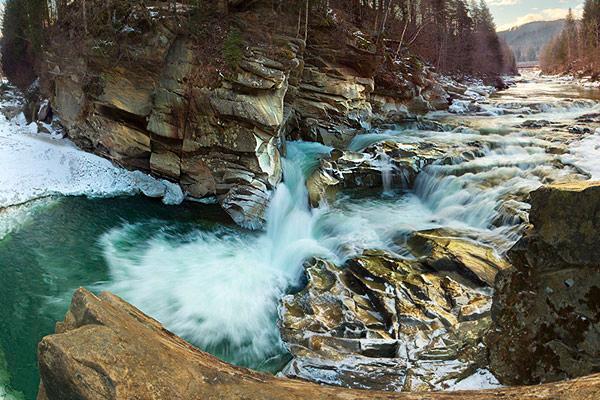 Река Прут превратилась в причудливый ледяной танец, отражающий блики солнца. Такое зрелище бывает не так уж часто, водопад Пробий застывает только при самых низких температурах.