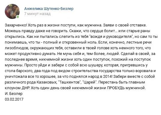 “Им плевать на всех: все мы для них просто мясо. Они палят по ВСУ из наших дворов, от садиков и школ, где находятся дети, они осмысленно вызывают огонь на нас, чтобы показать шокирующее зверство противника. Но мы все видим и знаем!!! Захарченко, тебе и твоим детям желаю вечно жить в паническом страхе, считать крохи на столе и мучиться от безысходности! Ты убиваешь своих земляков, как тараканов, и делаешь себе пиар на крови! Мы знаем правду, ее ничем не скрыть!”