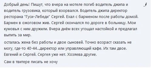 Более того, во время взрыва в припаркованном недалеко от “Мотеля” джипе погиб директор ресторана “Гуси-Лебеди” Сергей. По данным его знакомых, в этот вечер мужчина подвозил с работы бармена. Бармен выжил, сейчас находится в ожоговом отделении, управляющий скончался по дороге в больницу. У мужчины остались жена и двое детей.