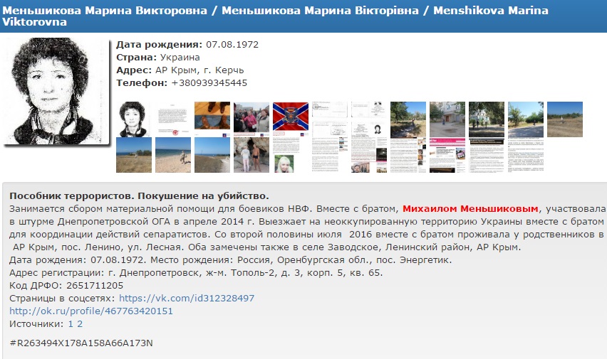 Данные о Меньшиковой есть на сайте "Миротворец", сообщается, что Меньшикова и ее брат занимаются сбором помощи для оккупантов и боевиков захваченного пророссийскими наемниками Донбасса.