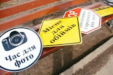 В Николаеве на улице Соборной появились «Места счастливых людей» - это 4 необычных знака с надписями "Место для объятий", "Время для фото", "Улыбнись и продолжай идти", «Только счастливые люди могут видеть эту надпись».