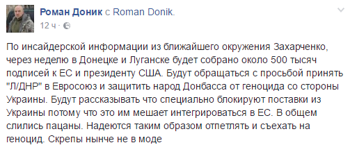Боевики псевдореспублик "ДНР" и "ЛНР" будут просить Евросоюз о присоединении к нему Донбасса. Такую информацию сообщил волонтер Роман Доник на своей странице в Facebook.
