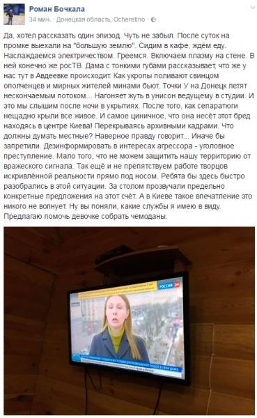 "Да, хотел рассказать один эпизод. Чуть не забыл. После суток на промке выехали на "большую землю". Сидим в кафе, ждём еду. Наслаждаемся электричеством. Греемся. Включаем плазму на стене. В ней конечно же росТВ. Дама с тонкими губами рассказывает, что же у нас тут в Авдеевке происходит. Как укропы поливают свинцом ополченцев и мирных жителей минами бьют. Точки У на Донецк летят нескончаемым потоком... Нагоняет жуть в унисон ведущему в студии. И это мы слышим после ночи в укрытиях. После того, как сепаратюги нещадно крыли все живое. И самое циничное, что она несёт этот бред находясь в центре Киева! Перекрываясь архивными кадрами. Что должны думать местные? Наверное правду говорит... Иначе бы запретили. Дезинформировать в интересах агрессора - уголовное преступление. Мало того, что не можем защитить нашу территорию от вражеского сигнала. Так ещё и не препятствуем работе творцов искривлённой реальности прямо под носом. Ребята бы здесь быстро разобрались в этой ситуации. За столом прозвучали предельно конкретные предложения на этот счёт. А в Киеве такое впечатление это никого не волнует. Ну вы поняли, какие службы я имею в виду. Предлагаю помочь девочке собрать чемоданы" - написал журналист.