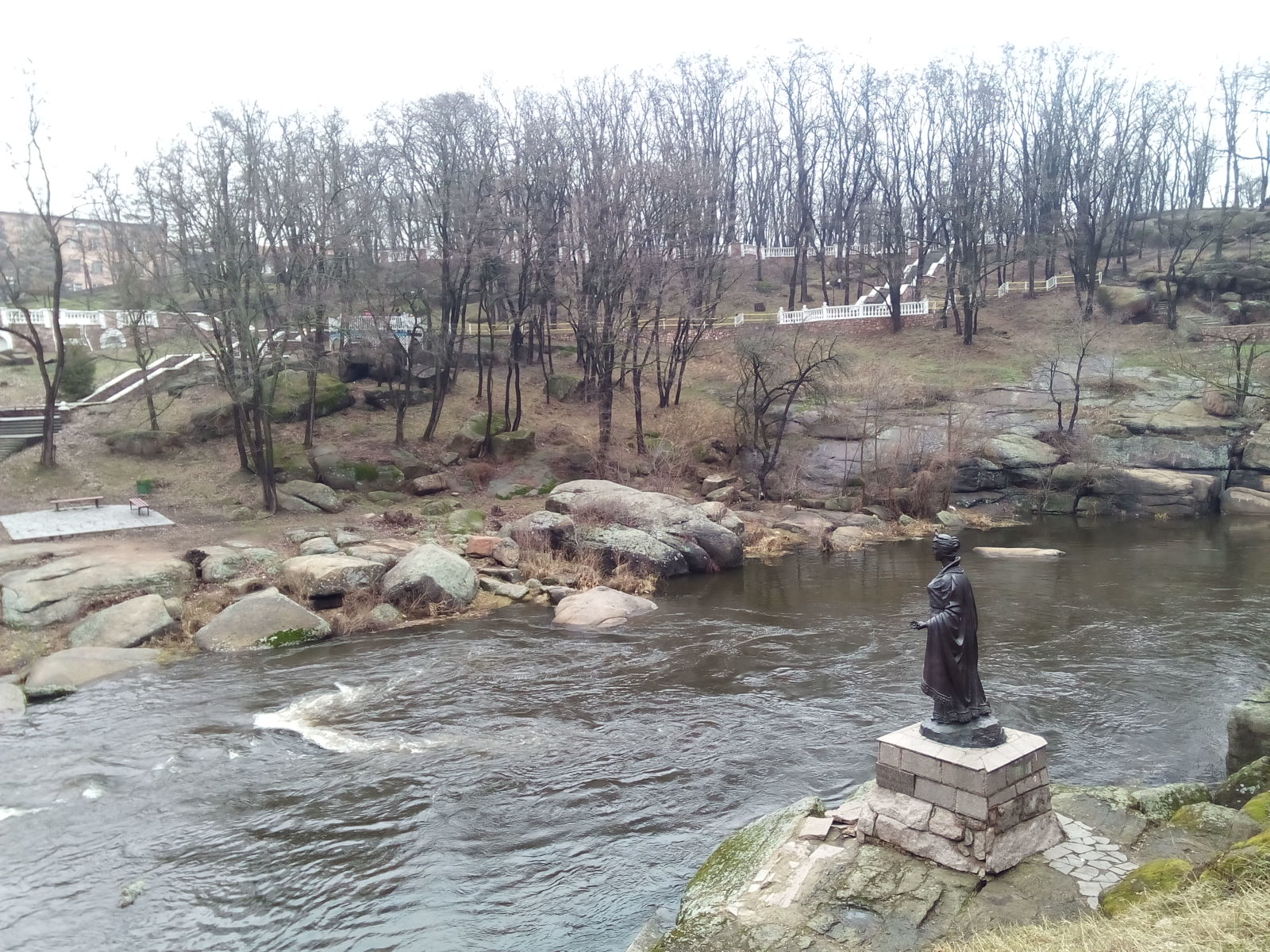 Конечно, город знаменит своей историей времен древлян. Здесь устроили прекрасный парк, в котором естественный рельеф хорошо сочетается с дорожками, лестницами и обзорными площадками. Наш гид сообщил, что памятник князю Владимиру обошелся в 1 млн. грн. Мать Владимира - Малуша - родом из Искоростеня, поэтому чуть дальше есть соответствующая скульптурная композиция.