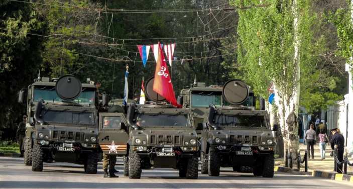 На плац прокремлевская администрация вывела около тысячи военнослужащих, кадетов и казаков. По центральной улице крымской столицы проехали почти 40 единиц военной техники, в том числе зенитные ракетные комплексы, Грады, Бтры и автомобили "Тайфун" и "Рысь", которые враг активно использует на Востоке Украины.