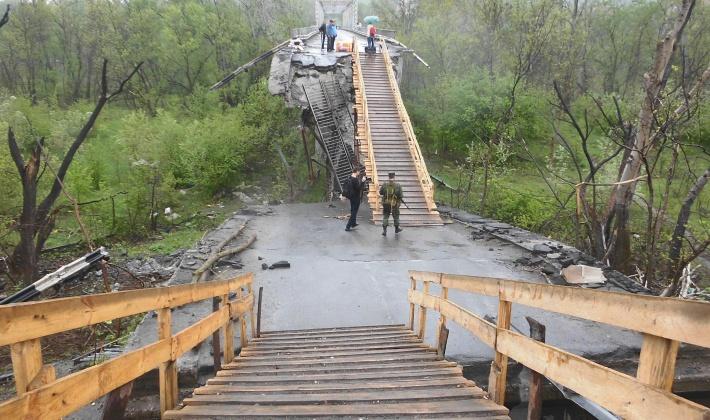 Пешеходный пункт пропуска в Станице Луганской очень непросто пересечь людям с инвалидностью. На блокпосту нет никаких приспособлений для этого, и наблюдателям ОБСЕ приходится собственноручно перетаскивать людей с ограниченными возможностями через разрушенный мост.