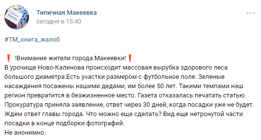 "В урочище Ново-Калинова происходит массовая вырубка здорового леса большого диаметра.Есть участки размером с футбольное поле. Зеленые насаждения посажены нашими дедами, им более 50 лет. Такими темпами наш регион превратится в безжизненное место. Газета отказалась печатать статью. Прокуратура приняла заявление, ответ через 30 дней, когда посадки уже не будет. Ждем ответ главы города. Что можно еще сделать?" - сказано в посте.