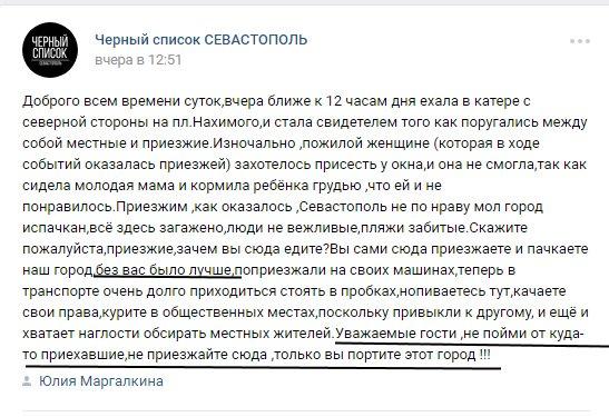 "Скажите, пожалуйста, приезжие, зачем вы сюда едите? Вы сами сюда приезжаете и пачкаете наш город, без вас было лучше. Поприезжали на своих машинах, теперь в транспорте очень долго приходится стоять в пробках. Напиваетесь тут, качаете свои права, курите в общественных местах, поскольку привыкли к другому, и ещё и хватает наглости обсирать местных жителей. Уважаемые гости, не пойми откуда-то приехавшие, не приезжайте сюда, только вы портите этот город!!!" - написала крымчанка.