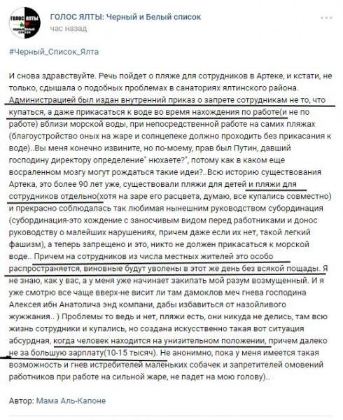 В посте в местной группе ВК сказано, что на протяжении всего существования "Артека" существовали пляжи отдельно для детей и для сотрудников, и вот теперь оккупационная "администрация" решила ввести такой возмутительный запрет.